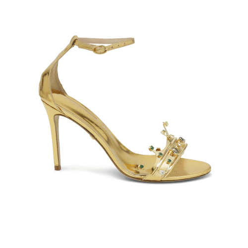 The Golden Age Open Toe Sandal is the perfect blend of style and comfort. This simple, yet stunning sandal is perfect for any occasion. The mirrored leather in gold is accented with our iconic jewel crown accessory embellished in multicolour Swarovski rhinestones. The result is a timeless look of elegance and glamour. Whether you're dressing up for a special event or just looking to add a touch of luxury to your everyday style, the Golden Age Open Toe Sandal is the perfect choice.